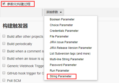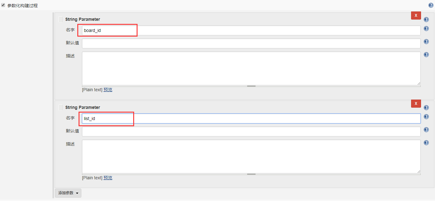 - 配置参数化构建。勾选参数化构建过程,添加两个字符串参数: