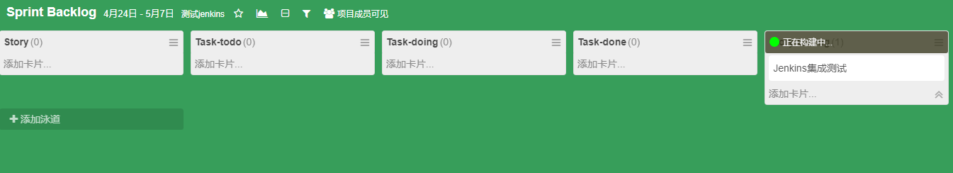 使用领歌集成 Jenkins 是在领歌驱动 Jenkins Job 的构建,并实时显示 Job 的构建结果。在领歌中将卡片拖到配置好的构建列中,会向 Jenkins 服务器发送请求。Jenkins 接收到领歌的请求后,进行构建,并通过 Notification 插件将构建结果发送到领歌。