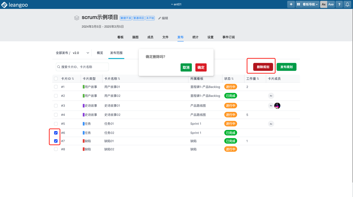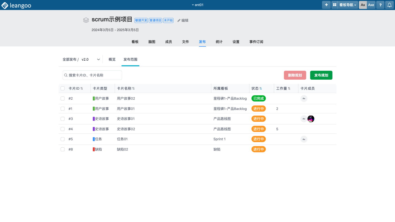 版本发布过程中,可将当前项目下某些看板中的卡片规划到当前发布中,作为本次发布的主要内容。