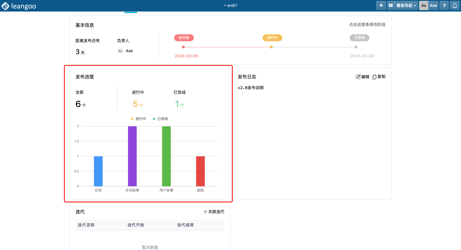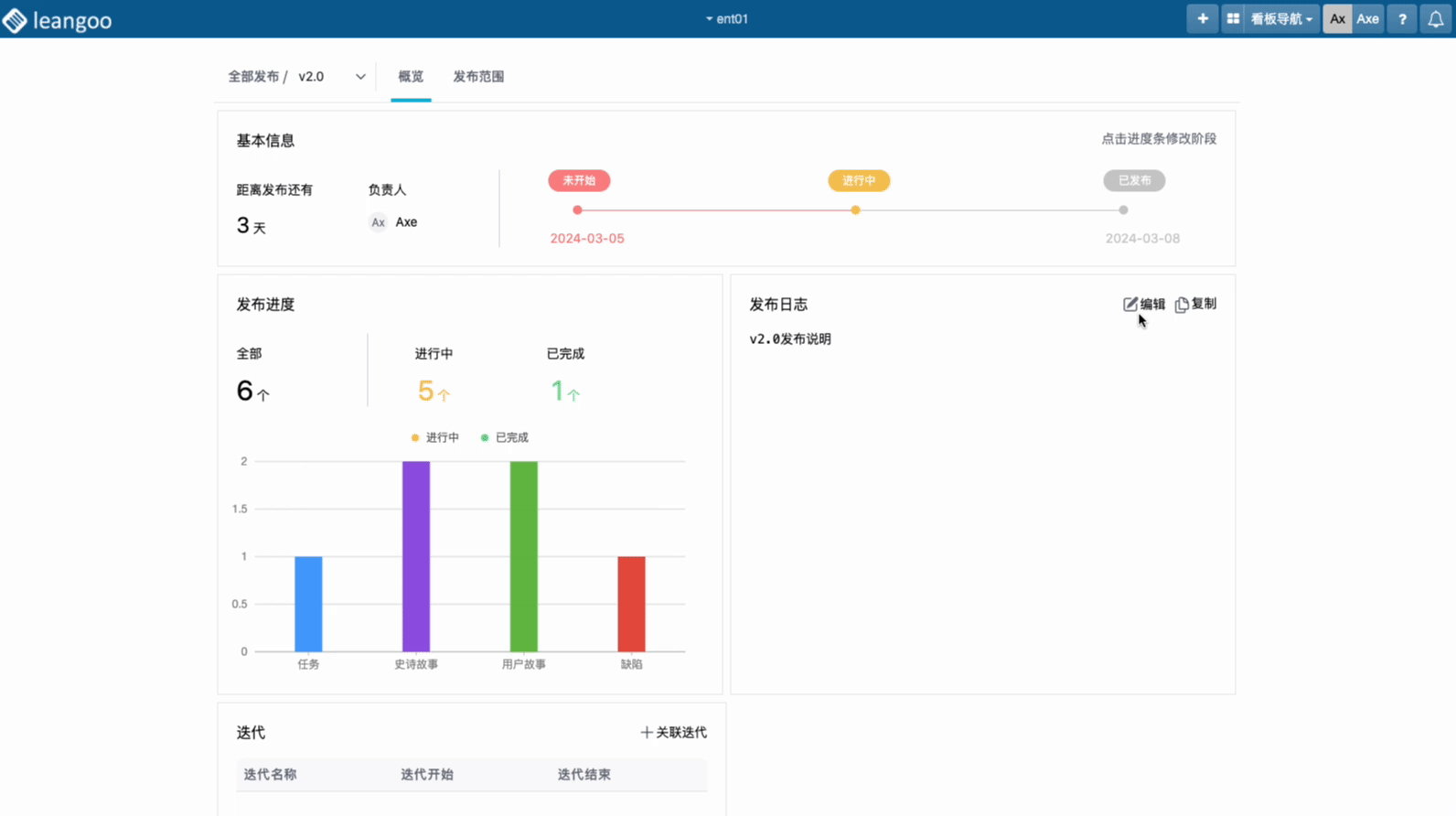 3.发布概览:显示发布的基本信息、进度、日志,以及与之相关的迭代。