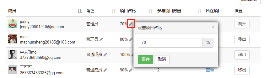 1.在项目成员列表上,设置项目占比