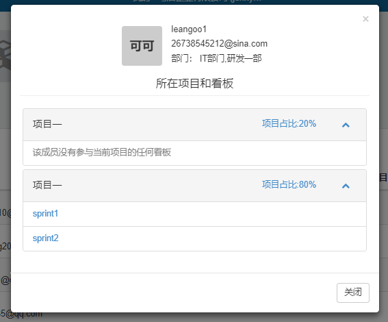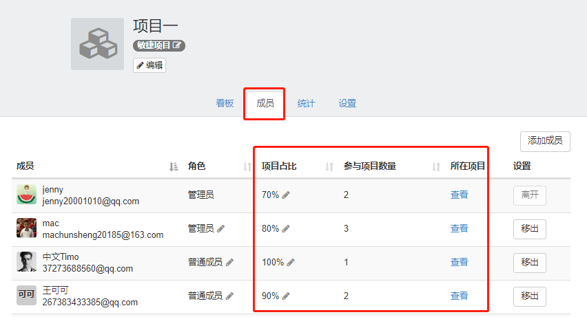 2.在项目成员列表上,查看成员在该项目的项目占比、参与的项目数量、参与的所有项目和看板