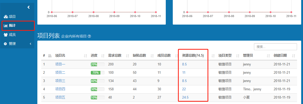 4.在企业的统计页面上,可查看每个项目的资源总数,及整个企业的资源汇总