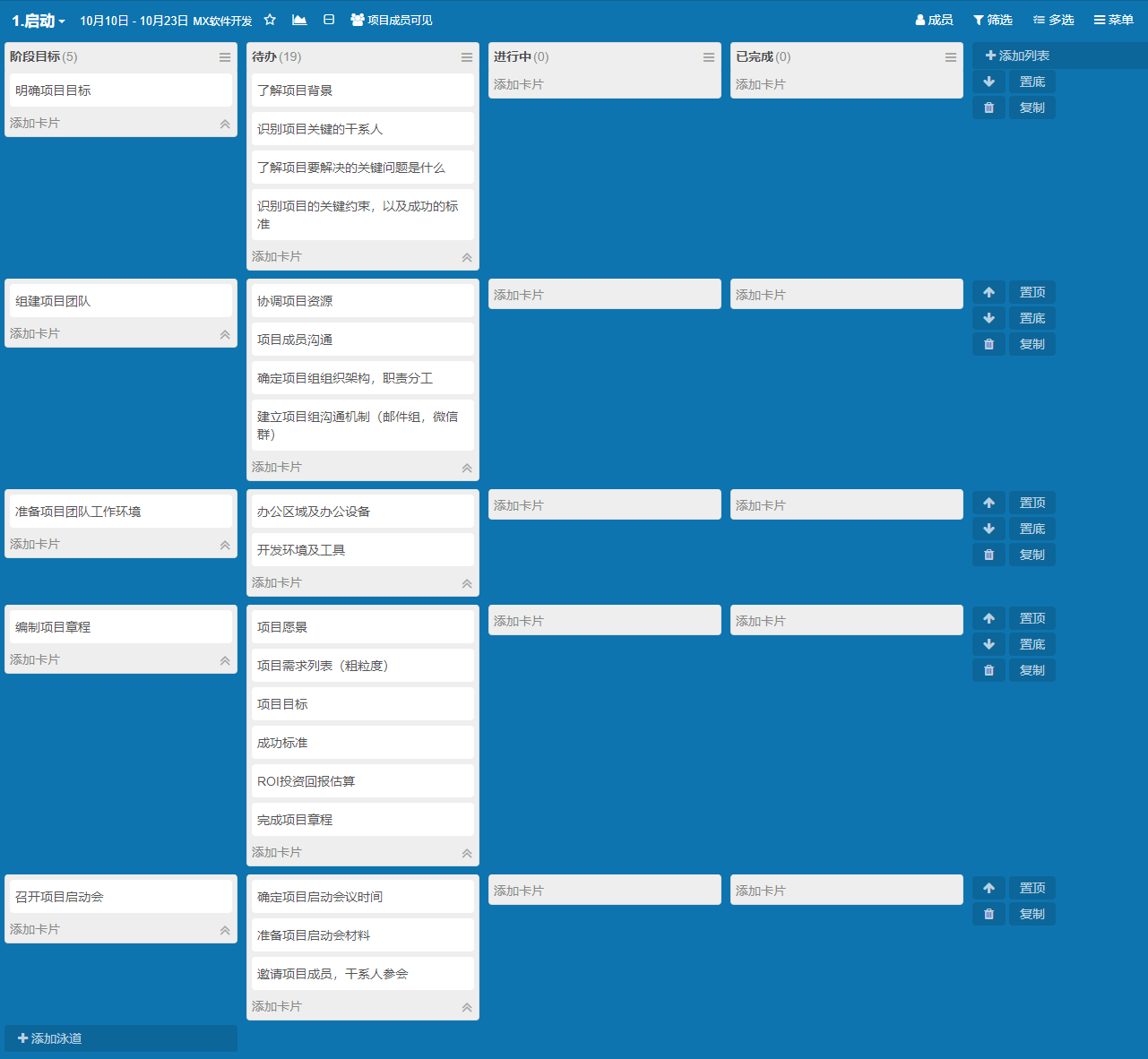 进入1.启动阶段看板内可以看到,看板内的第一列作为目标列,用于存放当前阶段的目标。每个目标对应一个泳道,目标列的后续列用于放置由目标拆分的任务。