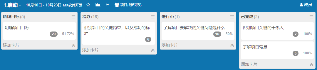 在完成目标的过程中,我们先将目标拆分成多个任务任务,并将其放到与目标同泳道的后续状态列表内。团队在完成任务的过程中,根据任务的不同状态将其移动到不同状态列表内(注意,是在同泳道内横向移动,以便保证任务与目标的对应)。等到所有任务都移动到已完成列表后,就表示目标已完成。