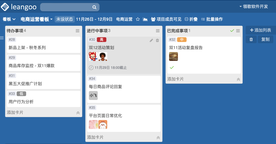 Leangoo 的看板功能能够直观展示所有任务,不同平台的日常运营工作一目了然。商品上下架、活动策划、数据分析等