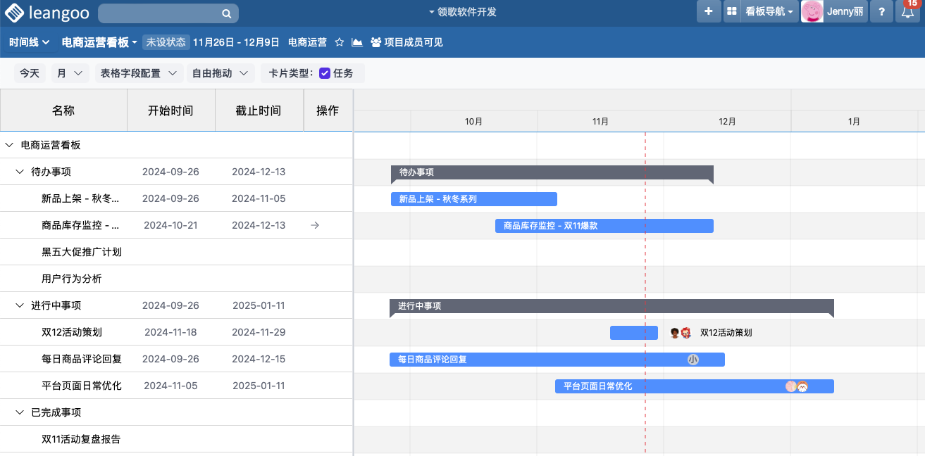 通过 Leangoo 的时间线视图(Gantt 图),运营者可以轻松掌握关键时间节点。不再担心忘记重要活动上线时间,也能合理规划促销前的准备工作。