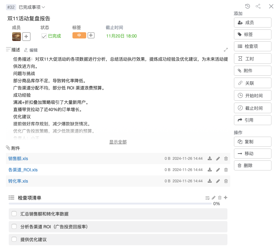 每一次活动结束后,Leangoo 的协作功能支持团队在线整理数据和经验,将复盘内容以文档或任务形式存储,方便下次快速调用,避免重复走弯路。