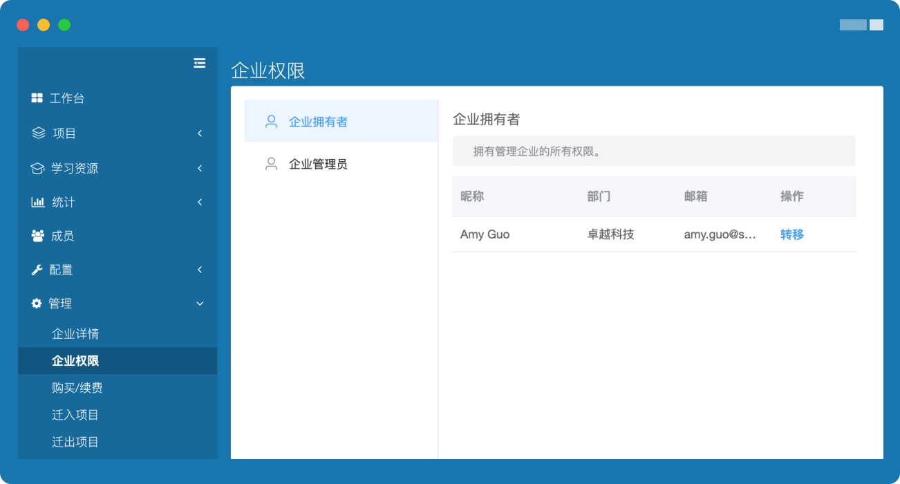 在企业管理中,可以编辑企业权限,企业中有两个最高级别权限,企业拥有者和企业管理员,方便领导层控制和管理企业内项目及成员。