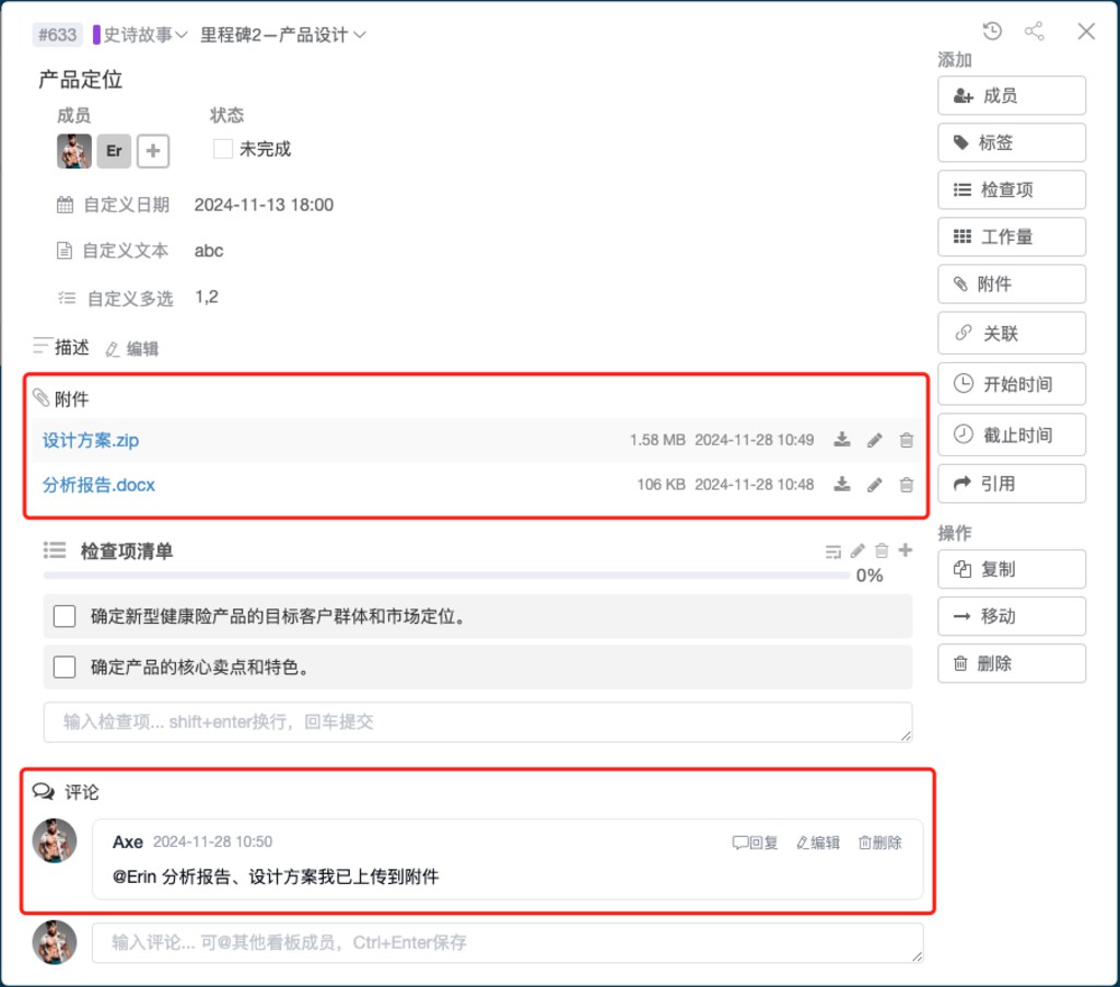 Leangoo 的任务卡片支持评论功能,团队成员可以直接在卡片上讨论任务细节,同时上传相关资料(如分析报告、设计方案)。相比传统邮件和会议模式,这种方式更加高效,确保所有信息都集中在任务本身。