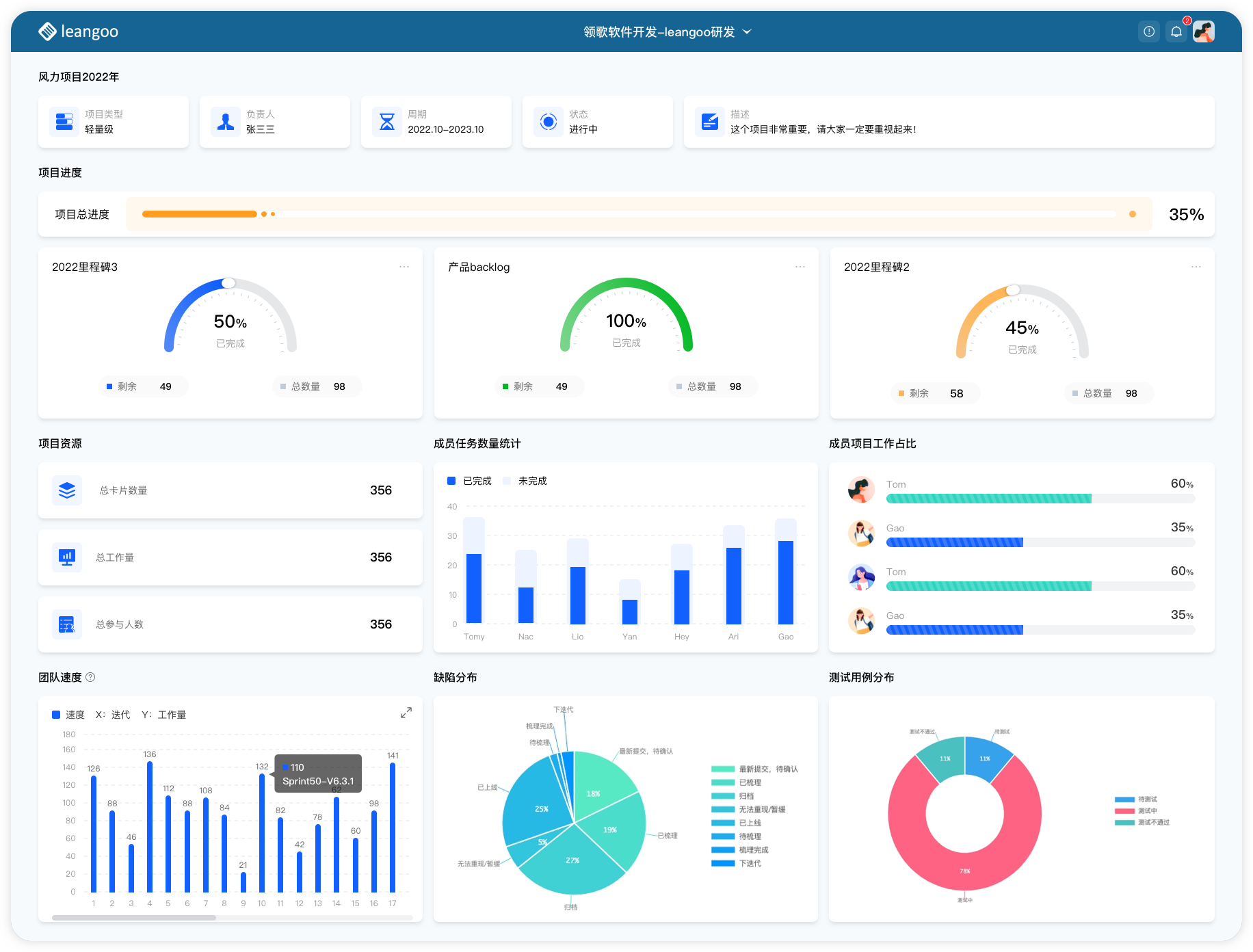 Leangoo中提供了项目视角的统计,方便企业管理者统一查看项目及项目下任务看板进度。根据不同的项目类型,提供了不同视角的统计。