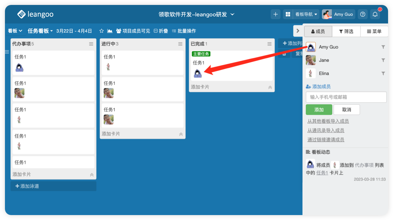 - 进入看板内,拖拽右侧成员头像至任务卡片上即可完成任务分配