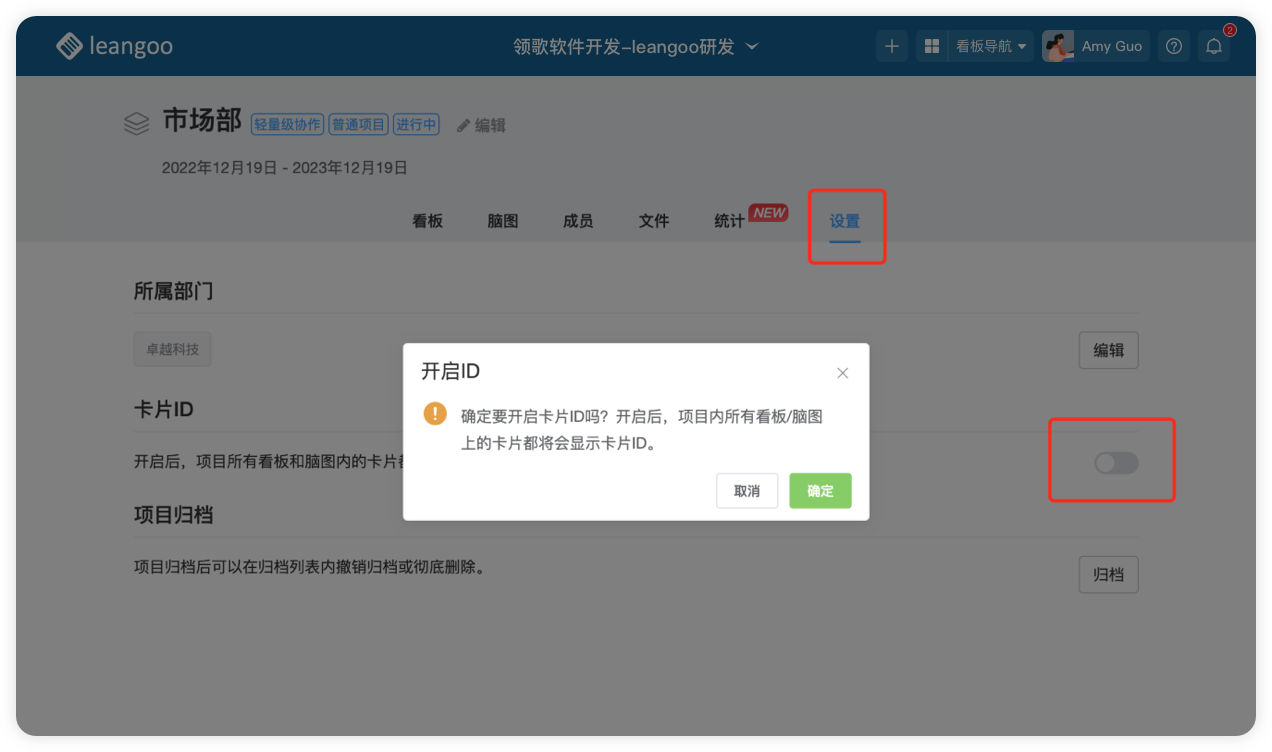 为了能更好的分配任务、查找任务以及快速定位某个任务卡片,Leangoo提供了卡片ID,在项目页面直接开启即可。