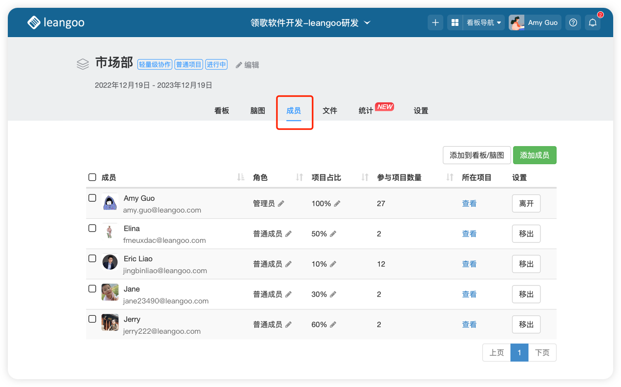 项目内成员可统一管理,可直接从企业内将成员导入项目,为项目设置项目角色、设置项目占比、查看成员参与项目数量及成员所在项目等。