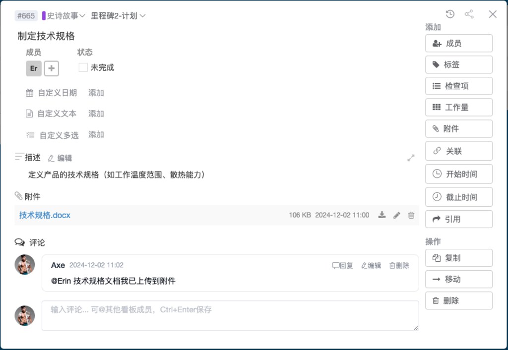 实时沟通与反馈:团队成员可以在任务卡片上直接评论、上传文件,避免了邮件沟通的低效和信息遗漏。