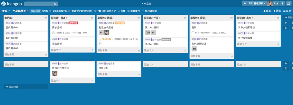 搭建项目看板:在Leangoo中为每个产品建立一个IPD项目,将研发、市场、采购等部门的任务集中到一个平台上,所有成员都可以实时查看任务状态。