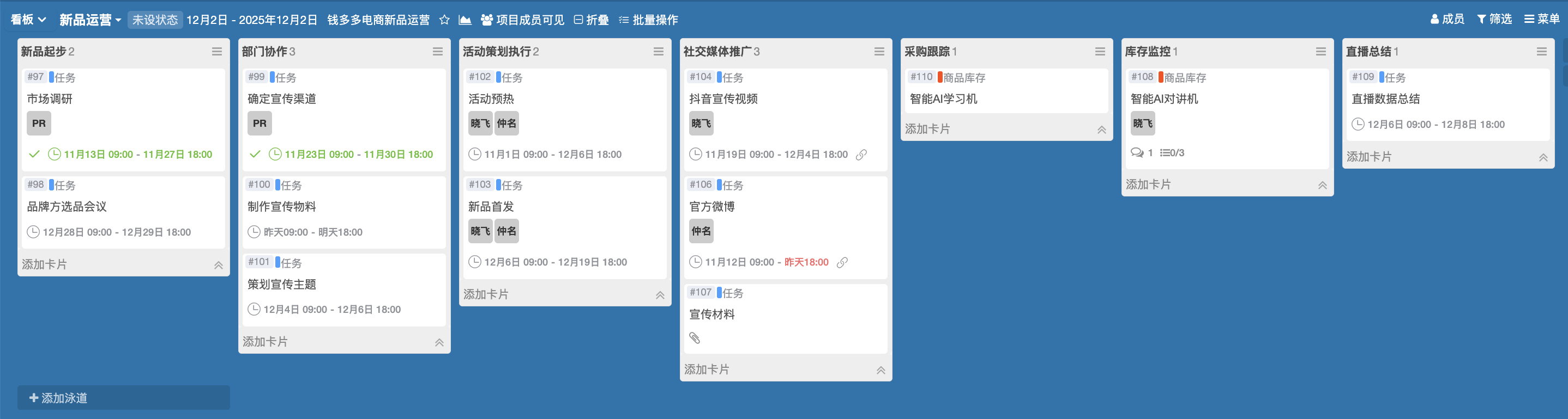 • 部门协作:新品运营涉及多部门。运营制定推广策略,市场推进品牌宣传,设计制作页面和包装,采购管理商品,客服准备售后。任务卡上添加评论附件等,信息共享,工作高效推进。