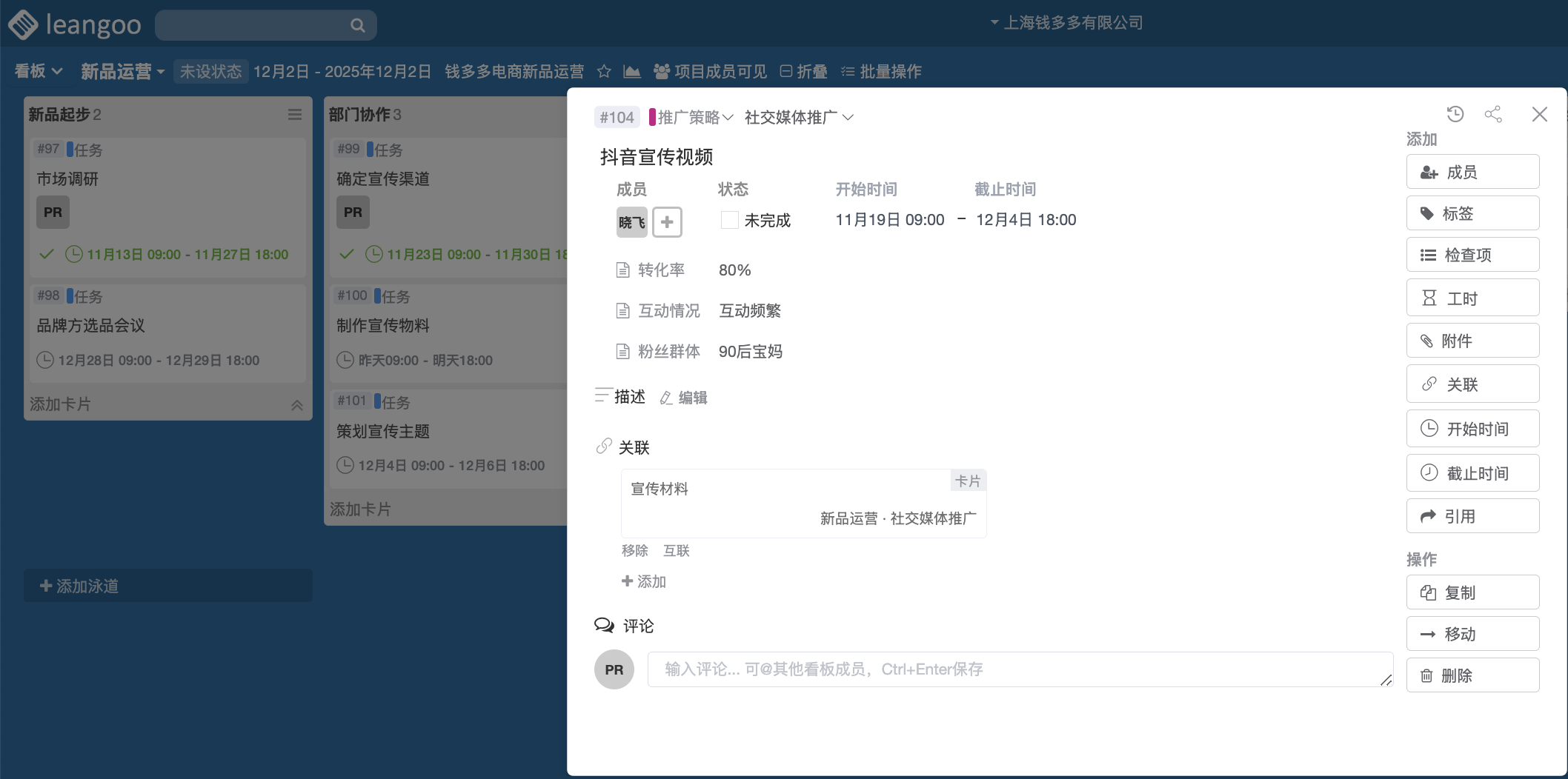 • 社交媒体推广:Leangoo 管理社交媒体推广。创建“社交媒体推广计划”任务列表,微信、微博、抖音等平台推广任务细化。将文件放在宣传资料的卡片,利用卡片关联和实时同步,实现素材共享 。也可以用任务卡分析数据,如粉丝、互动、转化情况,调整策略提效果。