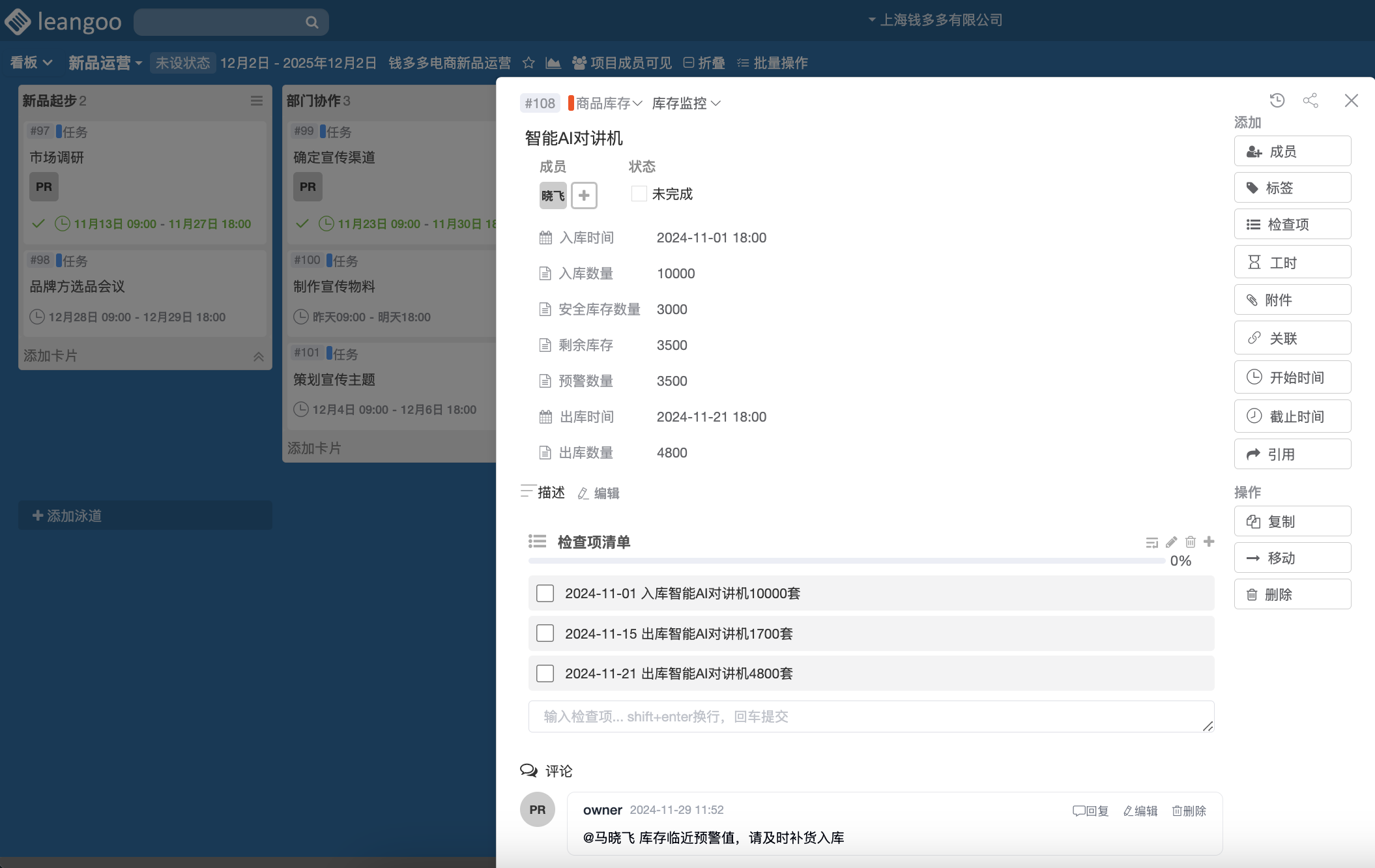 • 采购跟踪:采购部门在 Leangoo 建“新品采购任务”卡,记录商品信息和采购进度,如订单、发货、物流状态,让运营和客服知道到货时间。有问题在卡上沟通,找解决方案。