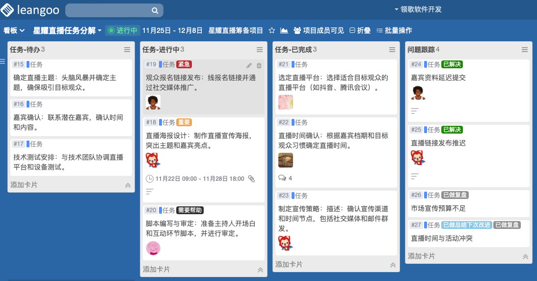 为了更高效地管理这些活动,我们选择使用 Leangoo 看板工具 来规划和跟踪直播的各项筹备任务,帮助团队更好地协作和推进工作。