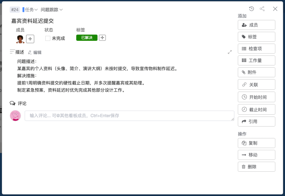 Leangoo 支持团队成员在任务卡片上添加评论或附件。我们利用这一功能,在任务执行过程中进行实时反馈。
