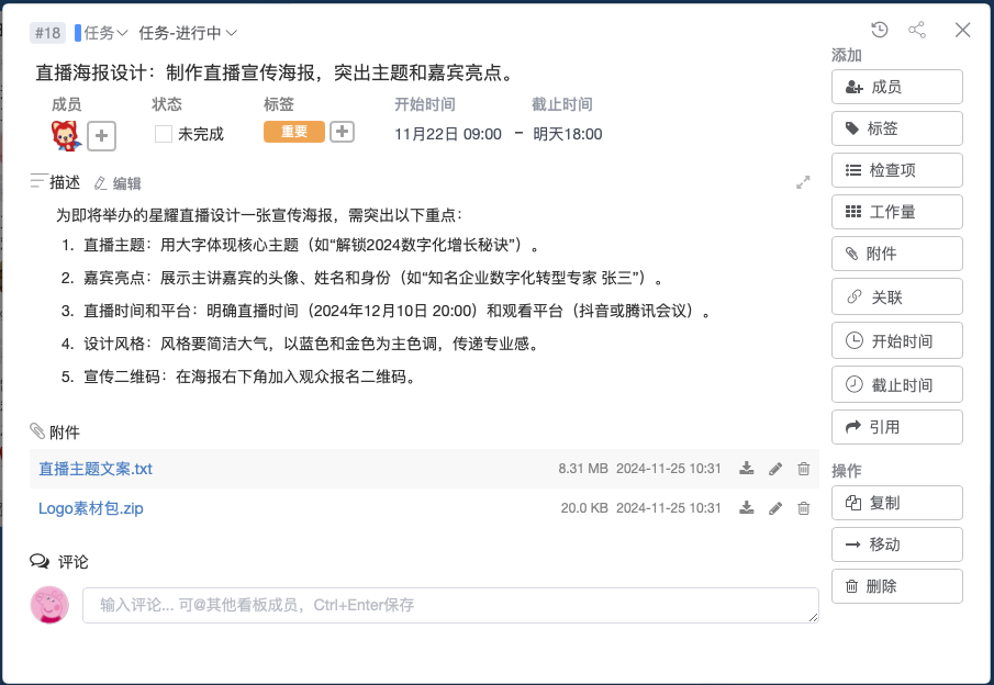 例如,设计团队上传直播宣传海报初稿后,推广团队可直接在卡片上提出修改建议,大幅提升了沟通效率。