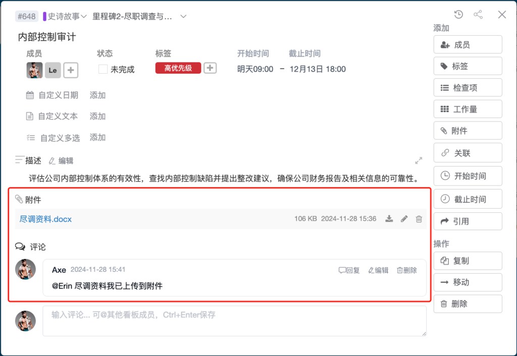 团队成员在同一个平台上实时协作。每张任务卡片不仅可以记录任务内容,还支持评论、文件上传和多方讨论。这样,团队成员无需通过邮件反复沟通,只需在卡片下方评论即可完成信息同步。