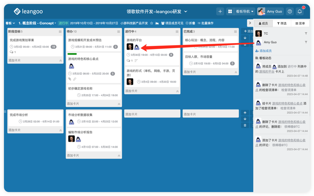 - 进入阶段看板内,拖拽右侧成员头像至任务卡片上,即为任务指定负责人