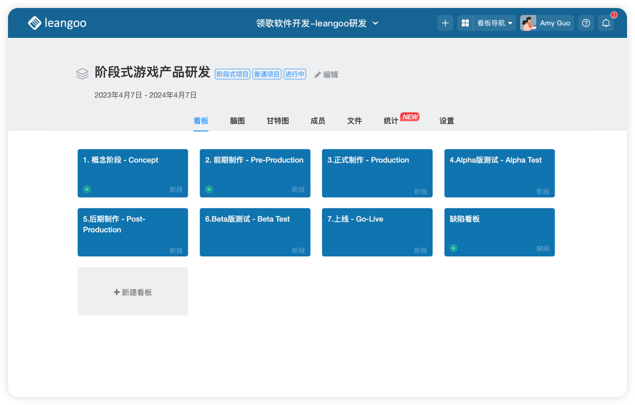 在Leangoo中,新建项目时,使用“阶段式游戏产品研发”项目模板创建项目。
