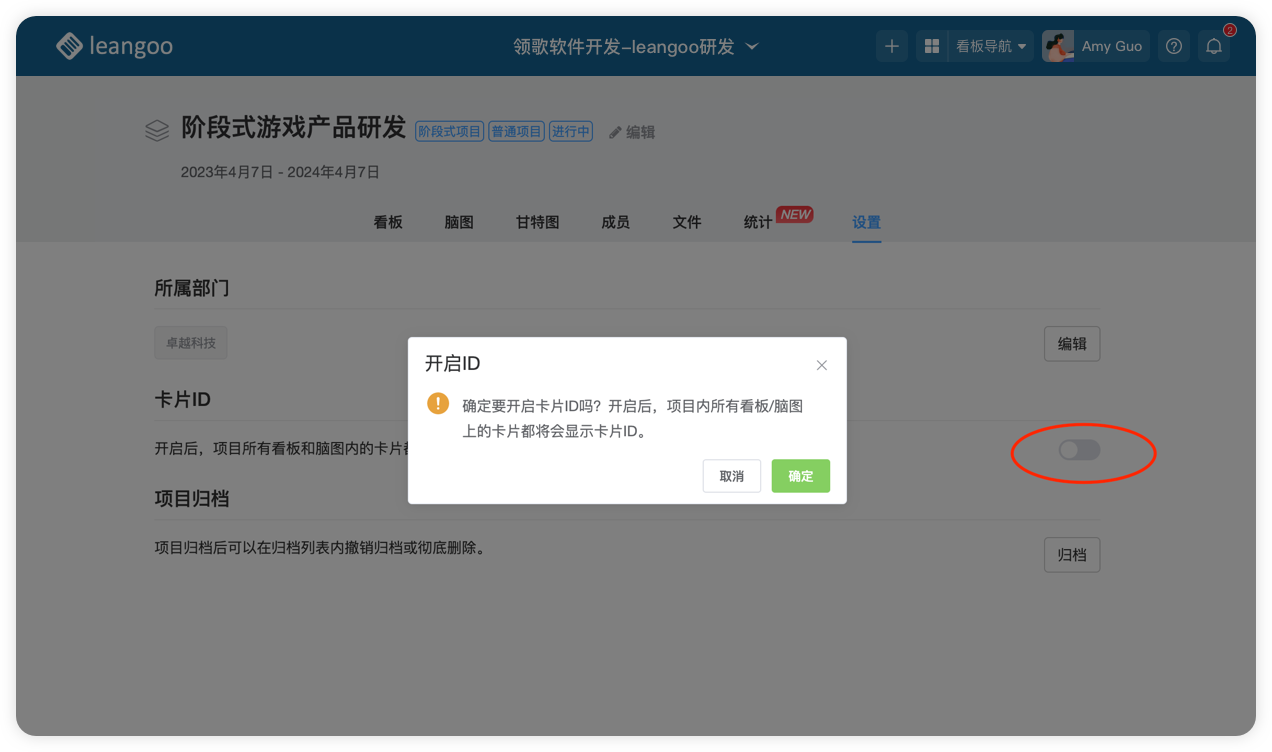 为了能更好的分配任务、查找任务以及快速定位某个任务卡片,Leangoo提供了卡片ID,在项目页面直接开启即可。