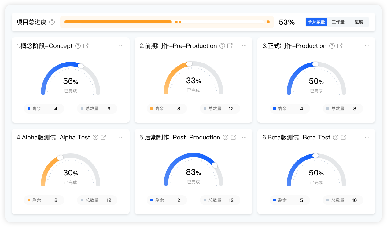 - 设置好完成列,即可以在项目统计页面看到每个阶段的任务完成情况和整个项目的总进度