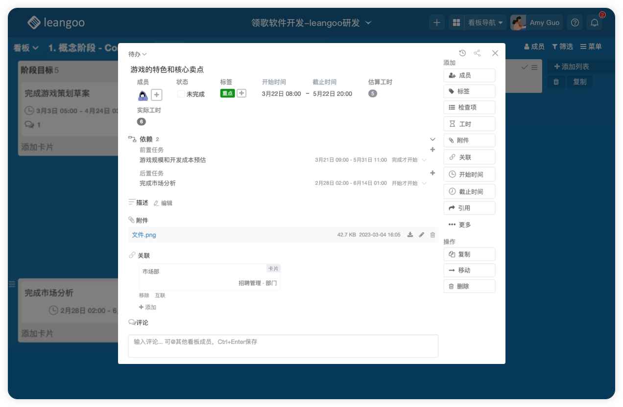 在Leangoo中,任务是以卡片的形式展示,一张卡片代表一个任务,在卡片内可以: