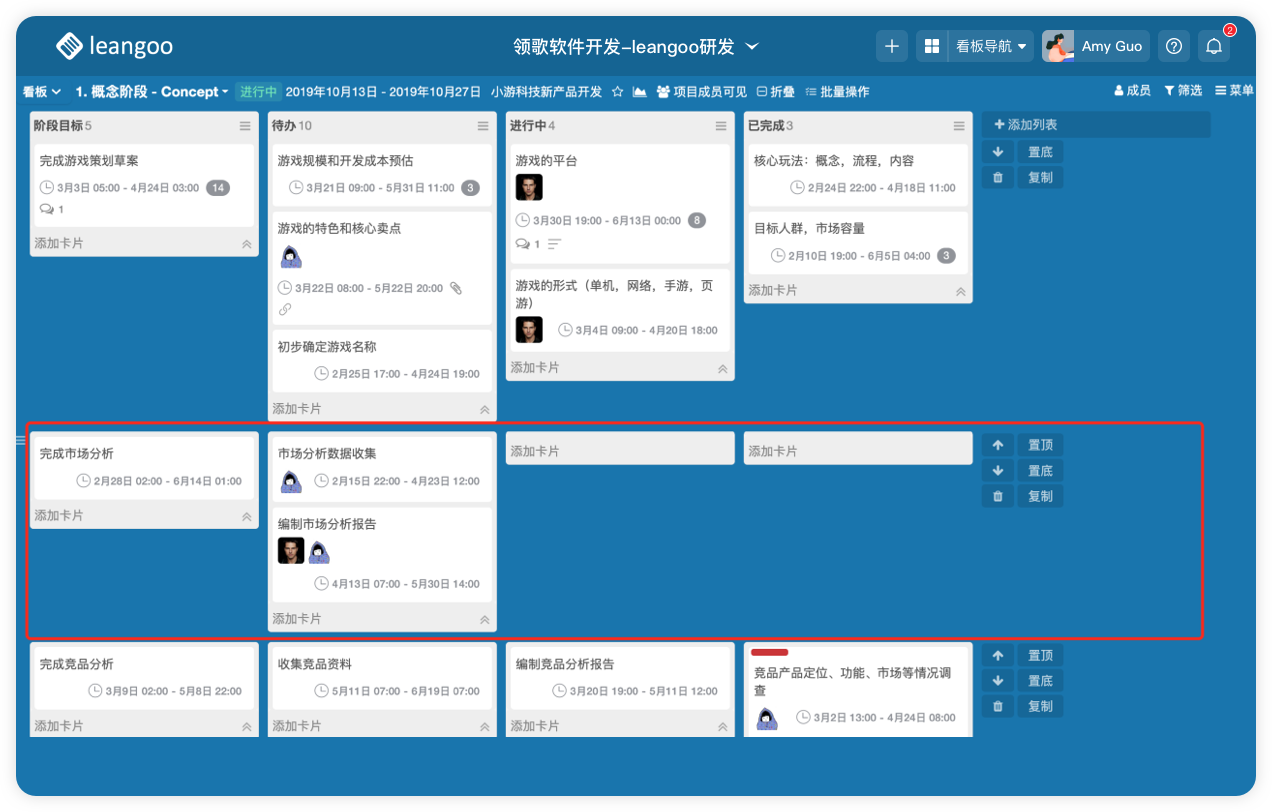 - 一个标准的阶段看板包括了:阶段目标,待办,进行中,已完成四个列表