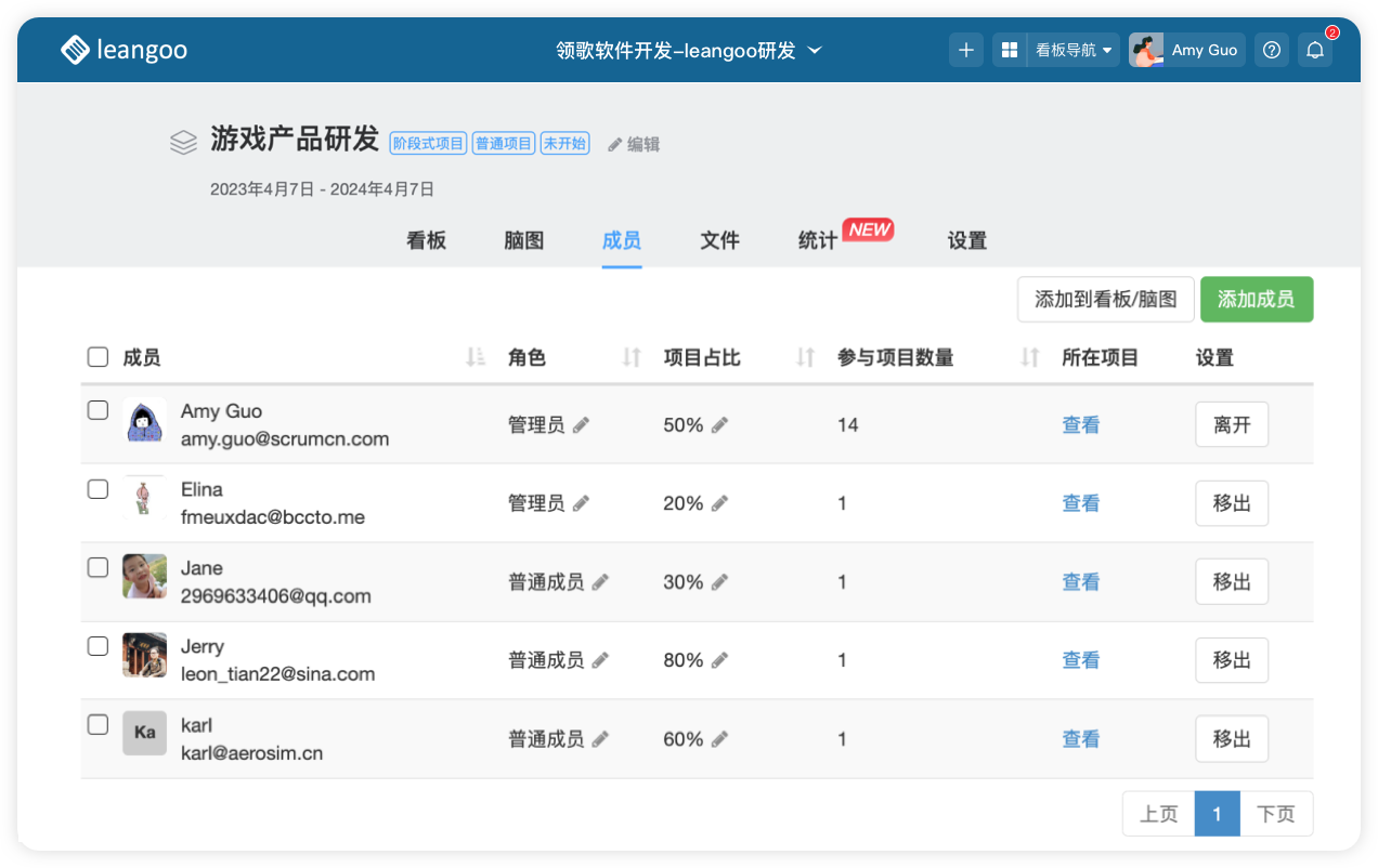 项目内成员可统一管理,可直接从企业内将成员导入项目,为项目设置项目角色、设置项目占比、查看成员参与项目数量及成员所在项目等。