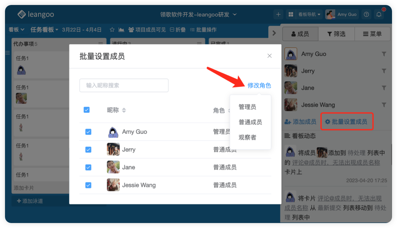 目前看板内成员权限分三种,点击右侧成员,可批量设置成员权限。