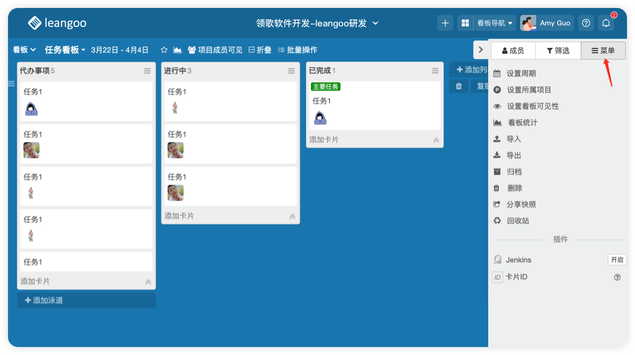 看板右侧菜单中,可以导入导出看板数据、删除看板、归档看板等等。