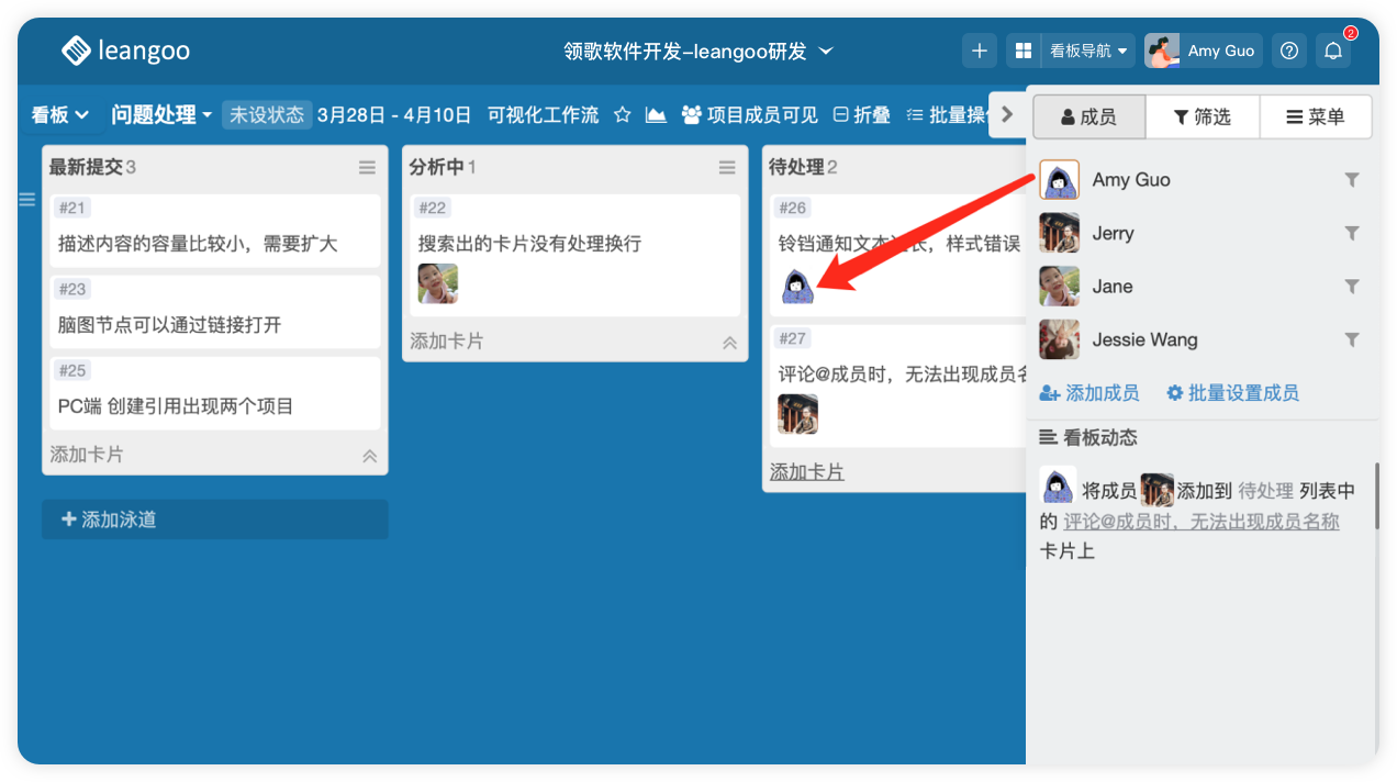 - 进入看板内,拖拽右侧成员头像至任务卡片上即可完成任务分配
