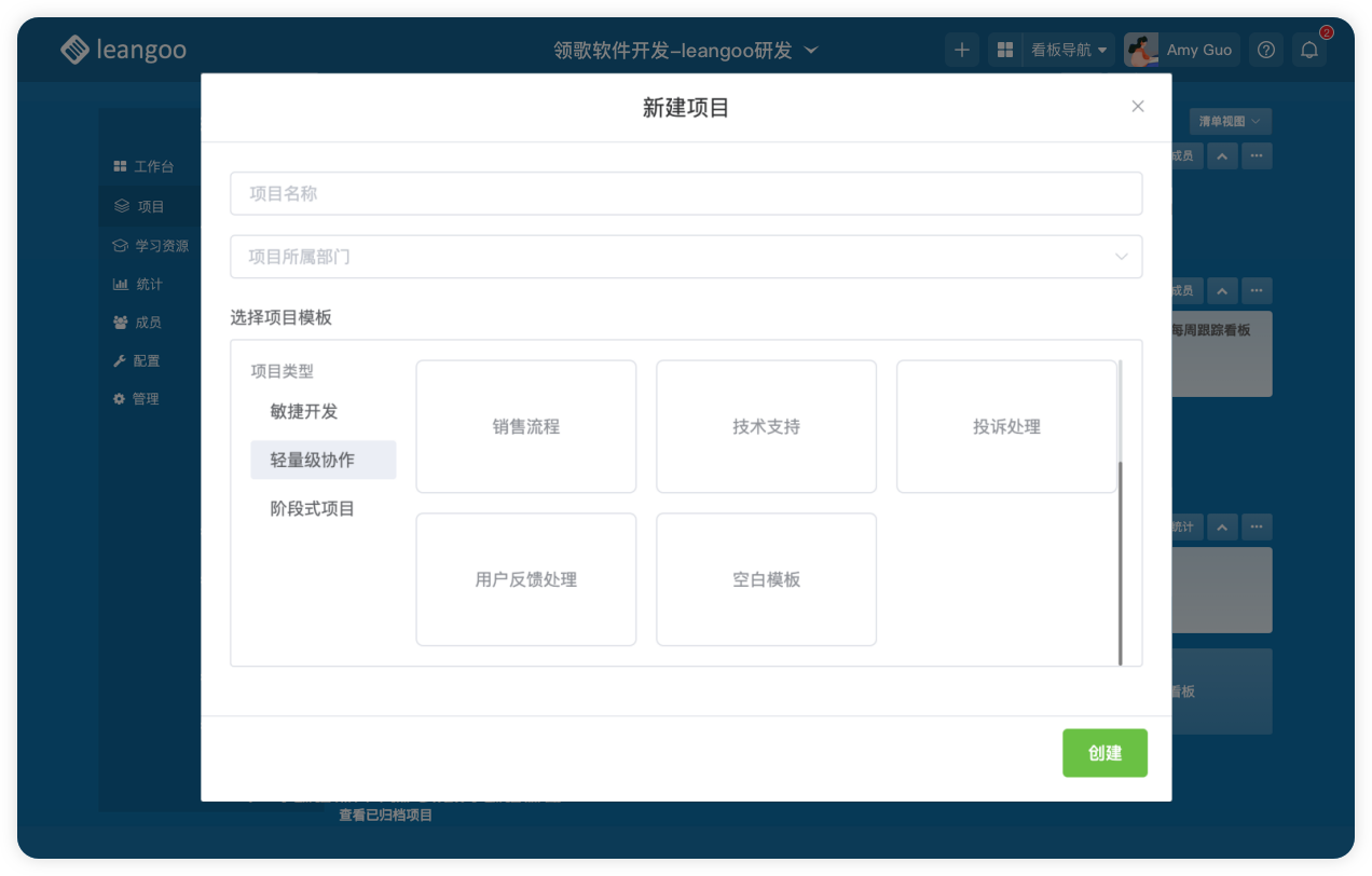 - 通过Leangoo轻量化协作项目模板,创建可视化工作流看板。Leangoo内置了一些项目类型,可按照需求选择