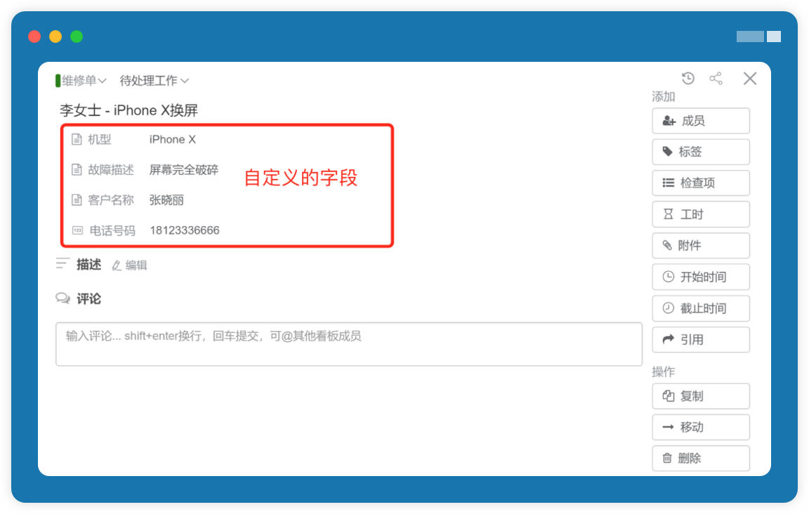 业务场景不同,工作的内容自然不同,所以工作流中流动的工作、记录信息也有差异,我们可以通过自定义字段和自定义卡片类型满足需求。
