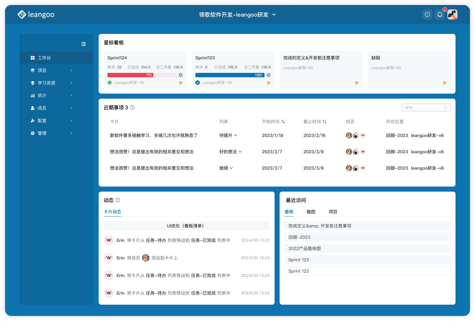 个人工作台是个人最新待办工作的展示区域,它展示了个人最新的待办任务,最新访问的项目和工作动态,当一个人在多个项目和看板上工作时,它可以帮助个人快速看到个人在各个项目的工作,快速进入任务看板处理任务。