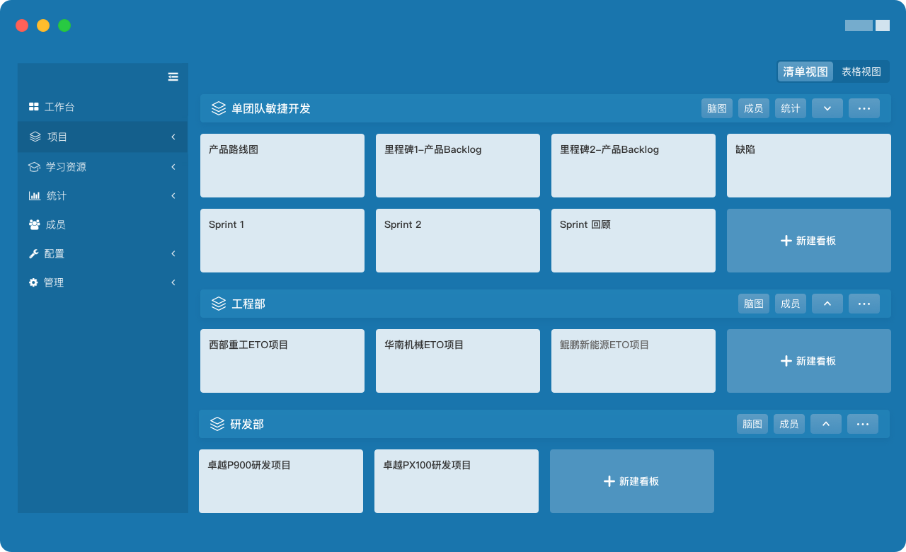 在项目清单页面中,可以全视角看到企业内所有的项目及项目内的所有任务看板,方便快速进入。 一个项目可以包含多个任务看板。也可以切换为表格视图模式。